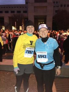 I had planned and laid out almost everything the night before so I quickly got ready to go and Jerrod bundled up because he was going to be biking along the course to see me at several points.  We were running just a few minutes behind when we were driving downtown and I realized, to my horror, that I had forgotten my bib.  Whoops.   I pulled a U-turn on College and ran back in the house to grab the bib.   Now, I was officially running late.