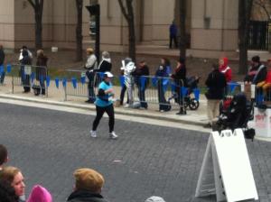Miles 11-13As I approached mile 11, it started to rain/sleet.  I was determined, though, to just keep going and at this point I began to really think it would be possible to run the entire race.  I was tiring and it hurt, a lot, but I just kept reminding myself that this is what I’ve been training for.  I could destroy my muscles and body today, but this was no training run, I was going to leave everything I had out on the course.  I finished my energy chews as I approached 16th and Meridian, where I knew Jerrod was going to be waiting again (this time in the sleet… what a trooper!) and kissed him as I ran by.  The last few miles were going to be hard and tough, but I was going to make it happen.  My friend Jess was along the course again cheering and it was an awesome burst of energy as I high-fived her and kept on going.   I wanted to walk, my body wanted to give out on me, but I would not give in.  I was going to run this thing to the finish.
